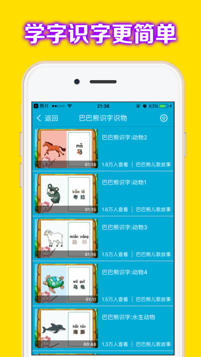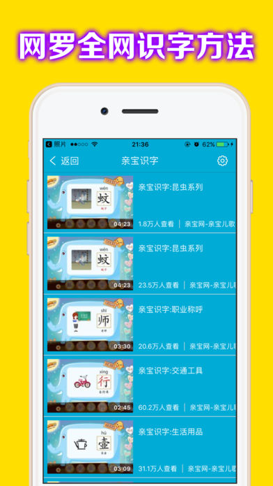 幼儿识字应用包括了 2~10岁的识字知识。 其中包括了巧虎学汉字、米卡学汉字、智象识字、亲宝识字、蓝猫小学识字、宝宝巴士学汉字、洪恩识字神童、洪恩识字、看图识字等近30个系列识字教育。肯定有一个适合您的宝宝的。