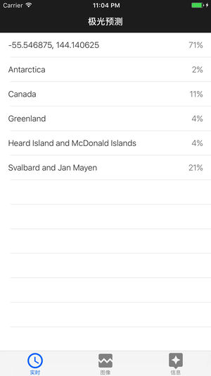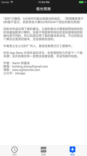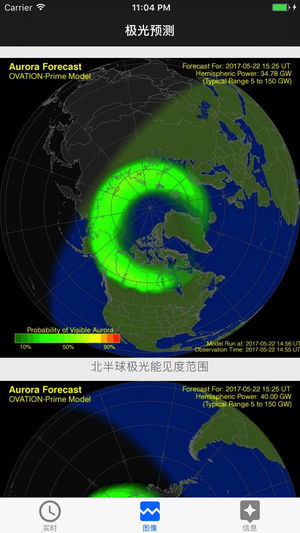 "实时"只展现,5分钟内可能出现极光的地区。(预测概率等于0的暂不显示,目前将会计算5分钟内244个地区的极光预测) 目前本作品应用了新的算法,之前的极光计算是按照地球收到的地磁指数来计算的,但是不同国家和地区的实际感受到的影响均是不同的,所以目前应用了新的算法来实现,不过目前这个算法还是测试版本,还会继续改进的。