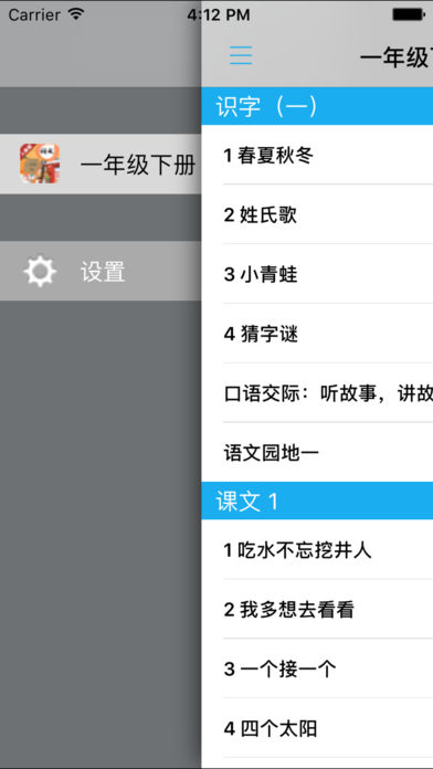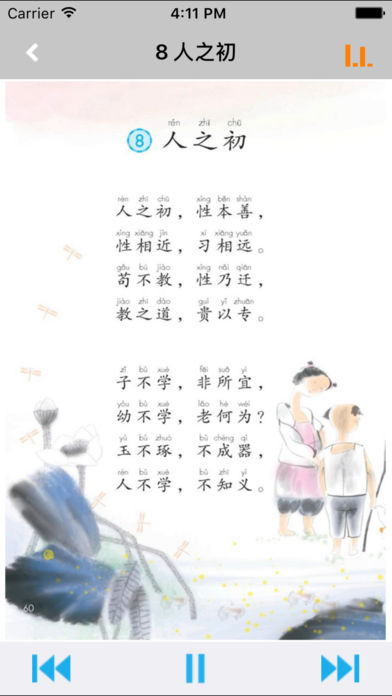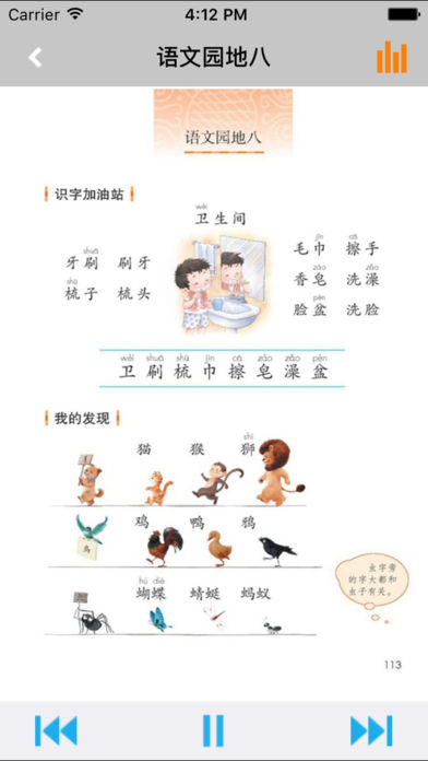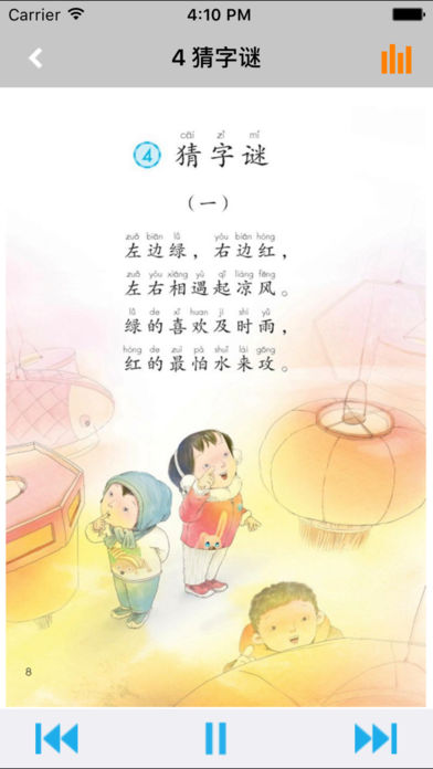 不单单是复读,【E-Learning】应用系列让您的iPad和iPhone变成学习机! 学生通过它随时随地完成课前预习、课后复习,学习能力更胜一筹! ***** 完全匹配教材,操作简便,哪里不会点哪里 ***** *根据教材配套,此应用为2017年人教版小学语文一年级下册完全最新版。 *涵盖教材全部内容,让您全面掌握拼音字母、生字、词语、句子、课文、故事、诗歌等课程内容。 *全套原版录音和教材完全同步,助您成为中文大明星。 *操作简便、携带方便,从此抛弃磁带和光盘。 【E-Learning】应用系列同步教材制作,内容完全一致,您可以使用它来进行课文学习,播放教材配套音频,配乐读音准确清晰,寓教于乐,让学习更高效和有趣! 此应用将成为孩子自学的专属外教,把家长从繁琐的辅导解答中解放出来!能点、能读、更能说,是学生的好老师、好家长! So easy!妈妈再也不用担心我的学习了,哪里不会点哪里! 功能特色 - 配乐读音准确清晰,怡情养性,陶冶情操。 - 内容与录音质量放心,语音纯正、朗诵有配乐。 - 语音播放灵活,快速翻页,目录跳转。 - 任意位置即点即学,复读模仿随时随地。 - 完全同步教材制作,内容完全一致。 - 支持后台播放,锁屏状态可随身听读。 - 界面简单大方,意图明了,功能实用,操作方便。 —【E-Learning】应用系列 — 适用于多种教学场景,您可以更加便捷地进行碎片化学习,期待您的使用! 致力于为中国K12教育提供最优秀的互联网教育应用软件! E-Learning乐园,伴随青少年健康快乐的成长! *****软件功能***** 1.通用应用,同时支持iPhone,iPod touch,iPad设备 2.可以自动顺序播放功能 3.可以自动记录播放位置,不用担心下次找不到听到哪 4.支持离线播放,即使不联网也一样听,到哪都不怕 5.支持手动拖拽前进、后退播放 6.在兼顾软件容量以及更多课程的情况下,我们最大限度保证音频的高质量,每个有声读物片段都是经过我们精选和亲测 7.最最重要的功能,可以拖动字幕定位,音频随之定位 本应用与《义务教育教科书2017年人教版小学语文一年级下册》课本同步 新版目录: 识字(一) 1 春夏秋冬 2 姓氏歌 3 小青蛙 4 猜字谜 口语交际:听故事,讲故事 语文园地一 课文 1 1 吃水不忘挖井人 2 我多想去看看 3 一个接一个 4 四个太阳 语文园地二 课文 2 5 小公鸡和小鸭子 6 树和喜鹊 7 怎么都快乐 口语交际:请你帮个忙 语文园地三 课文 3 8 静夜思 9 夜色 10 端午粽 11 彩虹 语文园地四 识字(二) 5 动物儿歌 6 古对今 7 操场上 8 人之初 口语交际:打电话 语文园地五 课文 4 12 古诗二首 池上 小池 13 荷叶圆圆 14 要下雨了 语文园地六 课文 5 15 文具的家 16 一分钟 17 动物王国开大会 18 小猴子下山 口语交际:一起做游戏 语文园地七 课文 6 19 棉花姑娘 20 咕咚 21 小壁虎借尾巴 语文园地八 识字表 写字表 常用偏旁名称表