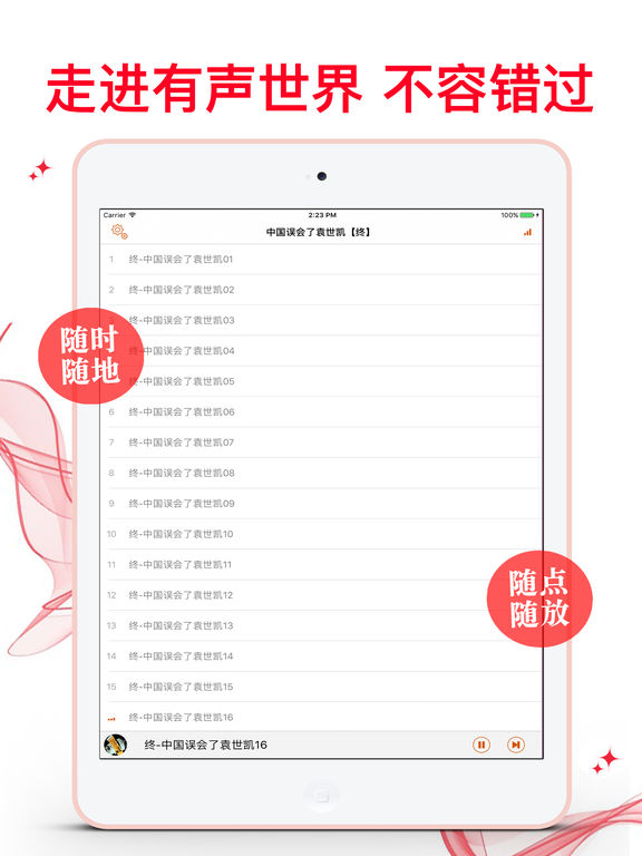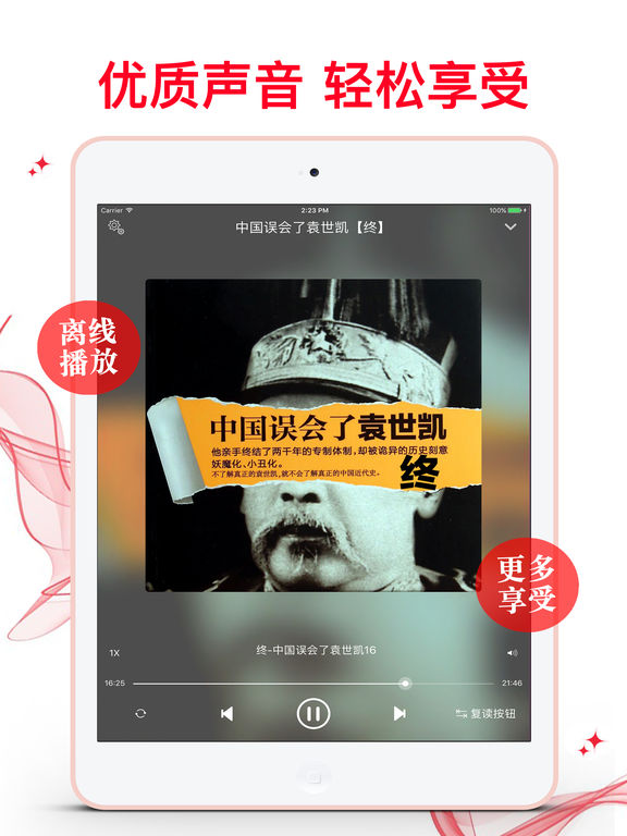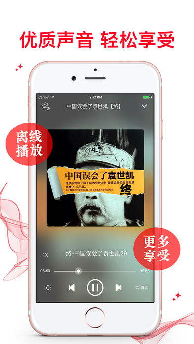 《袁世凯》共计三册,此为终极篇。 他是真正的爱国者,亲手终结了两千年的专制体制,却被诡异的历史刻意妖魔化、小丑化。不了解真正的袁世凯,你就不会了解真正的中国近代史。大变局时代,幸有袁世凯。中国误会了袁世凯,也误会了那段被扭曲了的、光怪六离的近代史。 甲申政变时的朝鲜王宫内,是袁世凯孤军杀入,夺回对朝控制权;“二十一条”的谈判桌前,是袁世凯殚精竭虑、寸步不让,艰难取得弱国外交的胜利,可我们误会了他是出卖主权的“卖国贼”。 甲午战败,中国几无可用之兵,是袁世凯费尽心血... 软件特色: 1.丰富的离线数据包,一次下载,随时享受 2.通用应用,同时支持各种设备 3.可以自动顺序播放功能 4.可以自动记录播放位置,不用担心下次找不到听到哪 5.支持离线播放,即使不联网也一洋听,到哪都不怕 6.支持手动拖拽前进、后退播放 7.精确到分钟的睡眠定时功能,让您睡眠更轻松 8.支持多任务功能,让您一边享受精彩有声读物一边还能打开其他的软件……做一切你想同时做的事 9.在兼顾软件容量以及更多课程的情况下,我们最大限度保证音频的高质量,每个有声读物片段都是经过我们精选和亲测