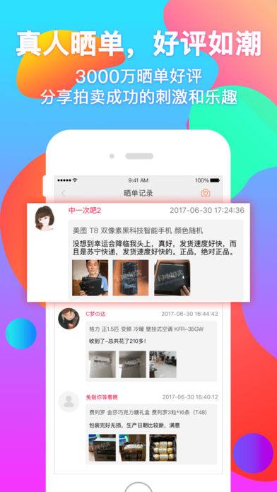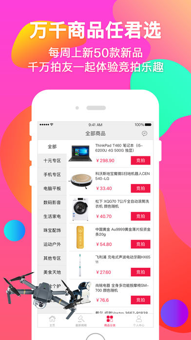 最刺激的趣味购物应用, 最新颖的电子商务理念, 最公平的网上拍卖平台, 为您提供全新的娱乐式电子商务购物体验。 【0元起拍,10秒竞拍】 全场商品初始价为0,每拍一次价格只上涨0.1元,10秒内无人竞争,您即可以前所未有的低价带走心仪商品 【商品丰富,任君选择】 手机电脑、数码影音、珠宝配饰、个护化妆、生活家电,上千种最新、最潮的商品应有尽有,想拍即拍! 【公平公正,好评如潮】 已有3000万用户晒单分享,93%用户拍下商品低于市场价1折。一款真正的用零花钱即可实现您的购物梦想的全新应用,现已打破传统电商理念成为新时代人人热捧的购物模式。 【新人福利,注册送5元】 注册立送5元,免费开启您全新的购物体验! 马上行动吧>>>