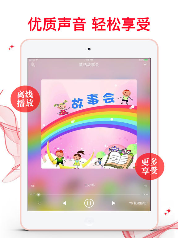 本应用中包含的童话故事,以丰富的想象力活跃宝宝的思维,生动的形象,美妙的故事可以帮助宝宝更早的认识社会,理解人生,他是引导宝宝做一个通达事理、明辨是非的好帮手。 软件特色: 1.丰富的离线数据包,一次下载,随时享受 2.通用应用,同时支持各种设备 3.可以自动顺序播放功能 4.可以自动记录播放位置,不用担心下次找不到听到哪 5.支持离线播放,即使不联网也一洋听,到哪都不怕 6.支持手动拖拽前进、后退播放 7.精确到分钟的睡眠定时功能,让您睡眠更轻松 8.支持多任务功能,让您一边享受精彩有声读物一边还能打开其他的软件……做一切你想同时做的事 9.在兼顾软件容量以及更多课程的情况下,我们最大限度保证音频的高质量,每个有声读物片段都是经过我们精选和亲测