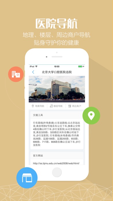 “北大口腔医院”是北京大学口腔医院总院以移动互联网、云计算、物联网、大数据等特点“智慧化”信息革命。应用含有北大口腔总院和北大口腔5个门诊部相关信息。 “北大口腔医院”APP旨在医院现有服务基础上,通过预约挂号、科室医生、医院导航、健康资讯、健康百科等多种简化患者就医流程的功能,减少就医等候时间,改善患者就医体验,提高医疗服务质量。 -----主要功能----- 1、预约挂号:掌上预约挂号,采用实名制预约,短信凭证高效就诊; 2、科室医生:掌握各院区科室医生的简介,医生擅长描述,轻松就医,安全贴心; 3、就诊攻略:直观查看各院区分布,提供乘车、驾车方式,方便您就医选择; 4、健康百科:海量医学知识库,不再错过,轻松掌握; 5、科室官网:科室微官网,查看相应科室知识、指南。 此外还有医院导航、健康资讯等实用功能,为您的健康保驾护航,第一时间提供专业便捷的移动医疗信息服务。 ------声明------ 北大口腔医院是北京大学口腔医院总院与杭州卓健信息科技有限公司联合研发