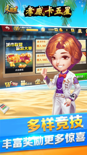 来游戏官方全新力作,引领棋牌手游新时代! =====游戏简介===== 孝感卡五星-来游戏,去掉万子和东南西北风,三人游戏牌型多胡牌快,结合孝感本地玩法,如未听牌需赔听牌玩家钱,亮倒未胡牌需赔听牌玩家钱。灵活的玩法配合来游戏的3D界面,欲罢不能。 =====游戏特色===== 【包房】新增特色包房,灵活创建房间,邀请好友竞技一决高下 【回放】边打牌边录像,牌局回放功能让你在回味牌局时还能炫耀牌技 【比赛】更多赛事活动搭配精美礼品,给用户无限可能 【角色】结合手游经典RPG,带着你的MM上牌桌,享受暴击快感 【宝箱】多样钥匙开启多种宝箱,欢乐多多惊喜不断 ====联系我们==== 微信公众…