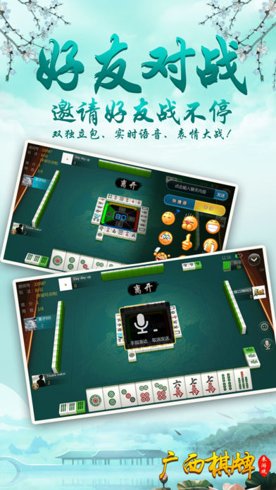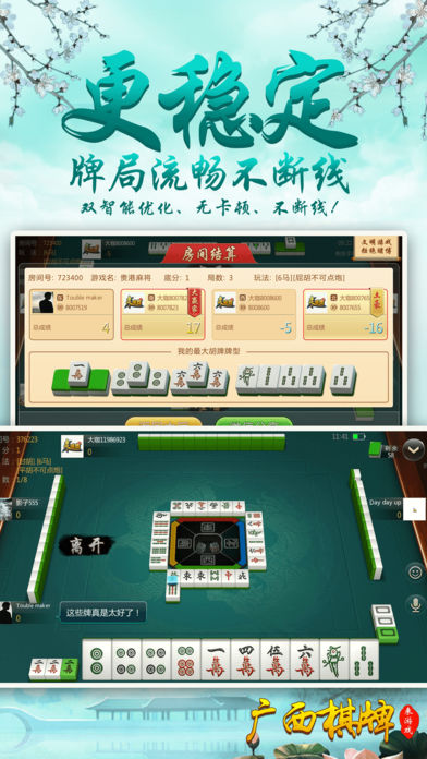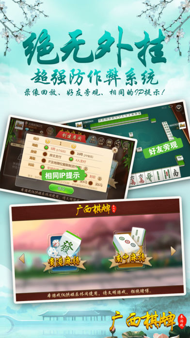 【最地道】 地道广西地区玩法,包含贵港麻将、南宁麻将,可碰、杠,不能吃牌,筒条万风共计136张牌进行4人游戏,杠钱单独结算,可买马。富有别致趣味性。要玩就玩广西人自己的麻将。 【最好玩】 再也不用苦于配桌,全民手机时代,你可以再手机上随时随地和亲朋好友搓麻将,是传统麻将馆的有力补充。快来和亲朋好友一起开房,决一高下吧! 【最稳定】 大厂出品,确保游戏过程更加稳定,专心玩游戏,没有掉线卡顿烦恼。 【最靠谱】 可以录像回放,同IP报警,杜绝外挂,真实可靠。 【最智能】 智能提示、界面大方更具人性化,支持智能单独、分开支付房费。
