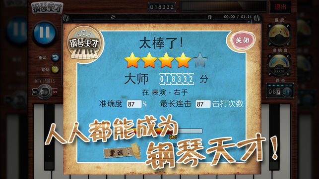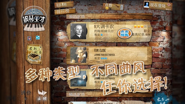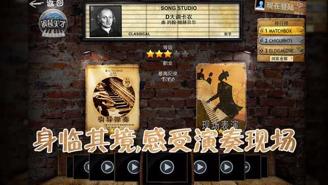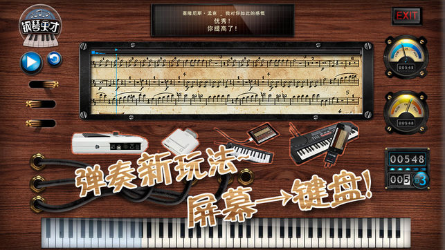 **最受欢迎可外接电子琴设备的演奏游戏** **真实弹奏体验,钢琴爱好者必备** **感受钢琴大师经典乐章的超凡魅力** **循序渐进冲击钢琴高手行列** 这款游戏绝对是钢琴音乐爱好者的最爱。超逼真模拟键盘,简单的操作,轻松的游戏指引,哪怕对五线谱完全不懂的音乐小白,也能弹奏出流畅优美的钢琴曲!对于有钢琴弹奏基础的玩家,这个游戏绝对是个福音,它不仅能提升弹奏乐曲的熟练度,还可以通过外接设备连接电子琴,真正做到虚拟游戏和实物产品的完美结合。让每个人都能成为《钢琴天才》! 游戏特色: *仿真钢琴键盘,自然真实钢琴音色; *外接电子琴设备,超凡脱俗; *主打古典钢琴曲,陶冶情操最佳选择; *两种…