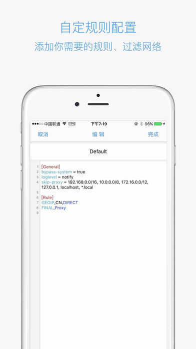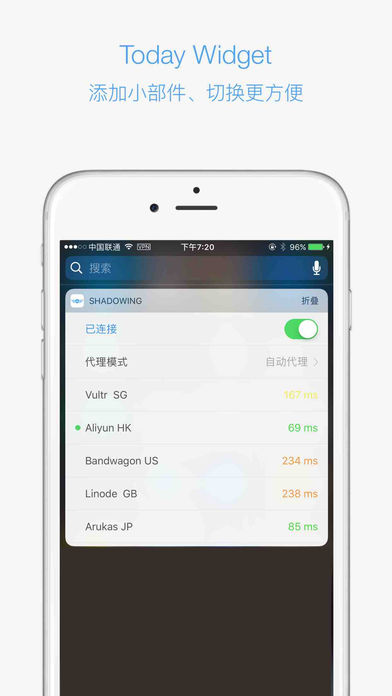 Shadowing is a rule-based proxy utility. It can capture all HTTP/HTTPS/TCP traffic from any applications on your device, and redirect to an proxy server following highly configurable rules,so that it can speed up or filter the network. Features • Scan QR code - QR can be proxy and URL of the rules. • Ping - each node automatically pings six times each time. • Define rules - Import rules from URL, rules list information left slide, you can delete, edit, view the rules information. General users can use the default rules. • View and edit node information - node list information left slide, you can delete, edit, view the proxy information. • Today widget - When add today's widget,start、stop or switch proxy by today's widget. Note: This app has no proxy account,just a utility. ========================================= Shadowing 是一个基于规则的代理工具。 它可以代理手机内所有 HTTP/HTTPS/TCP 流量,并根据自定义的规则转发给代理服务器或直接丢弃,从而达到加速和过滤网络的效果。 特 性: • 支持扫描二维码 - 扫二维码可以支持:代理生成的二维码、规则地址生成的二维码。 • 支持Ping,显示线路延迟 - 为保证准确性,每个节点每次自动 Ping 6次。 • 支持自定义规则 - 可以从URL下载规则。规则列表左滑可以编辑和删除规则。一般用户使用自带的默认规则即可。 • 查看和编辑线路信息 - 线路列表左滑,即可删除、编辑、查看代理线路的信息。 • 今日组件 - 添加今日组件,无需打开App,开启和切换代理。 注意: 此App不自带账号,纯粹的代理工具。必须自行添加账号方可使用。 ========================================= 【自定规则】 一条规则由三个部分组成:类型, 值, 操作 例如:DOMAIN-SUFFIX,cdninstagram.com,Proxy [操作包含]: DIRECT、REJECT、Proxy [含义]: DIRECT: 直接访问 REJECT: 拒绝访问 Proxy: 代理访问 [类型包括]: DOMAIN、DOMAIN-SUFFIX、DOMAIN-KEYWORD、IP-CIDR、GEOIP [含义]: DOMAIN:匹配请求的域名。 例如:DOMAIN,instagram.com,Proxy 匹配instagram.com的域名,走代理。 DOMAIN-SUFFIX:匹配请求的域名后缀。 例如:DOMAIN-SUFFIX,image.instagram.com,Proxy 匹配域名后缀为:image.instagram.com的域名,走代理。 DOMAIN-KEYWORD:匹配域名中包含的关键字。 例如:DOMAIN-KEYWORD, instagram, Proxy 匹配包含 instagram 关键词的域名,走代理。 IP-CIDR:匹配处在给定域内的 IP。 例如 IP-CIDR, 17.0.0.0/8, Proxy 匹配IP域17.0.0.0/8 走代理。 GEOIP: 匹配给定地理区域内的 IP。 例如 GEOIP, CN, DIRECT 匹配中国IP走直连。 [其他规则]: FINAL,Proxy [含义]: 若访问的域名没有匹配的规则,设置走代理。 ========================================= 【部分用户遇到的问题】: Q: 配置无误,但无法联网? [问题分析] 可能没有授权Shadowing 使用网络。 [解决方案]: 1.若第一次安装,可能会遇到 “允许Shadowing使用数据” 的系统提示(iOS10以后需获取用户权限),请点击允许。 2.若不小心点击了‘不允许’,请进入“设置-无线局域网-使用无线局域网与蜂窝移动的应用-Shadowing,允许其“无线局域网与蜂窝移动数据” 即可。然后重启App。 3.若从没有系统提示,请按照方案上面方法2中修改任意一个 App 的蜂窝数据设置,然后再打开 Shadowing 便会弹出系统授权通知,点击允许。 Q: 没有开启Shadowing的情况下,Ping总是超时。 [问题分析] 若您开启了同类软件,Ping是不通的。原因:目前Shadowing的 Ping功能使用系统默认的路由,若您开启了同类软件,会修改了系统的路由,会导致Ping不通。 [解决方案]: 若您使用Shadowing的Ping功能,请关闭其他同类软件。