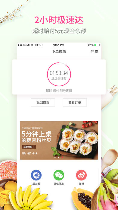 优质生鲜,2小时到。 下载注册即送新人专享优惠。 为了全方位满足吃货的需求,我们的商品已经涵盖了水果、肉蛋、水产、蔬菜、饮品、乳品、零食、轻食、粮油等9个品类, 是2,000,000吃货值得信赖的选择。 【产地直采】精选全球优质食材 资深食品买手团队常年在美国,智利,南非,澳洲等多个产地深入探索,只为把适宜的气候条件和地理环境下的优质食材送到您餐桌 【严格品控】我们知道,您的选择意味着信任。 每一款食材都要经过严格的筛选,只有合格率超过90%的食材才能入库进行第二次挑选。对每一道环节的严格把控,只为不负您的信任。 【2小时极速达】新鲜不应长久的等待 除华北、华东、华南三地分选中心外,我们已在全国8个城市建立了165个社区配送中心,保证站点辐射3公里内的用户,全部 配送过程由自有人员完成,保证2小时将美食送到您手上。 【全程100%冷链体系】新鲜需要更专业的保障 我们拥有冷库总面积最大的专业冷链物流体系,分三大温区保存食材,覆盖整个运输及储存过程。从 产地到舌尖,给您最原始的新鲜。 【一站式购齐一日三餐】400余款5星级精选食材,每周至少30款新品上新 我们用心挑选,只为您所见的每一款商品,都是精品。