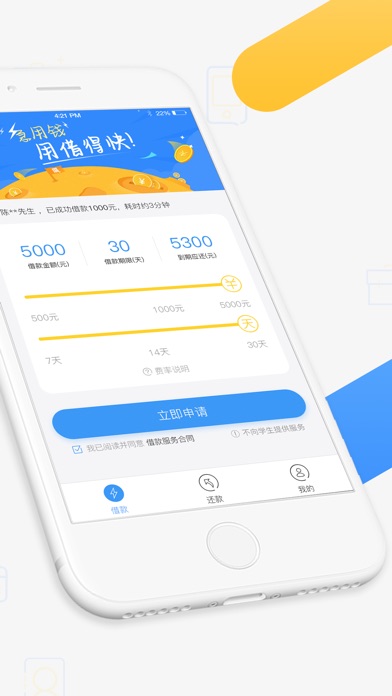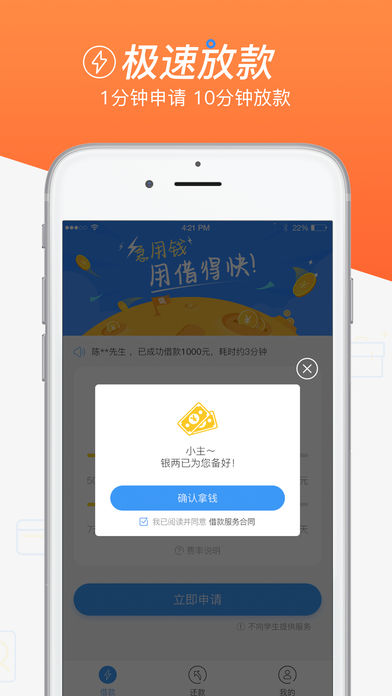 借得快-借钱就是快!借钱、借款、贷款、手机贷款就找借得快 最高5000现金,1分钟申请秒批到账。 【产品特色】 1、零门槛借款:无抵押无担保,有身份证就能借。 2、便捷借款:7*24小时业务受理,1分钟在线完成申请。 3、极速到帐:一经审批通过,10分钟内即可到帐,直接打入绑定银行卡。 4、应急贷款:7-14天短周期灵活借款,随借随还。 5、老用户贷款特权:无需再次提交资料,秒级审批放款。 【关于借得快】 借得快是上海聚蓝金融信息服务有限公司旗下移动智能借款平台,提供纯线上小额现金借款服务。依托大数据挖掘分析和机器学习等技术,实现快速精准的个人信用评估和授信,全程网上即时自动化审批。公司通过与阿里巴巴云计算、知名第三方支付公司等深入合作,为用户提供全方位、多层次的安全和隐私保障。 借得快管理团队由阿里巴巴、外资银行等知名互联网和金融行业资深人士组成,在互联网和金融领域具有丰富经验。 【联系我们】 微信客服:jiedekuai888