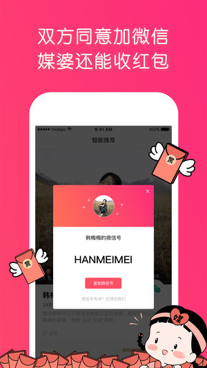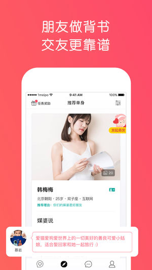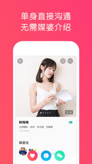 徐小平、姚劲波等大佬们、还有BAT、京东、网易、小米、华为等众多互联网企业也已强势入驻媒婆圈推荐身边优秀单身青年! 1号媒婆是一款靠谱免费单身婚恋交友平台,有“媒婆”和“单身”两种身份可以选择。“媒婆”可以一键将身边单身好友聚在一起,并为他们的真实身份做背书,单身可与同一媒婆或其他媒婆旗下单身自由互动,无需媒婆介绍。 产品介绍 【用户真实】真人媒婆背书,真人真资料真心找对象。 【圈层计算】通过媒婆与媒婆,媒婆与单身之间的社交关系网,实现大数据下的圈层计算。 【智能匹配】通过用户的基本资料,兴趣爱好,择偶条件,圈层计算,大数据匹配等方式实现用户的智能匹配,推荐用户更精准。 缘分是天时地利的…