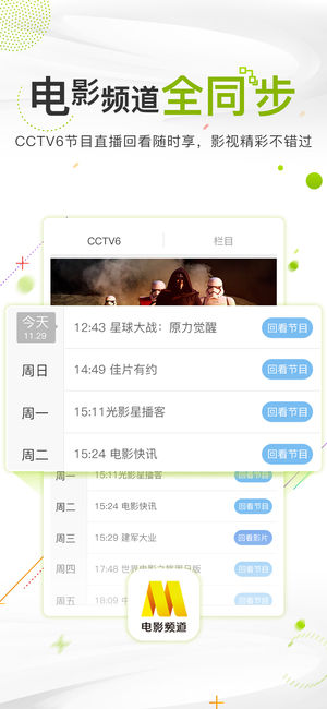 电影频道客户端,一款有品位、有态度、有内容的优质电影类垂直应用。 知电影,爱生活。让电影离你更近。 【直播】电影首映礼、独家幕后探班、明星专访播不停 【观影团】免费观影,来和明星主创、影评人面对面交流 【CCTV6】线上同步电影频道节目直播与一周回看,手机也能随时随地看电视 【观影】海量片库随心选!主题片场良心荐!帮你摆脱“影慌症” 【电影百家】百位资深影评人与电影达人,良心影评配搭千种观点交锋 【今日推荐】原创资讯超有料,全天精彩一早送达 【独家栏目】《鹦鹉画外音》《周游电影》《今日影评》等独家栏目带你涨姿势 【原创短视频】最in的热点,最hido的创意,最给力的剪辑 【热门影讯】聚集海量电…