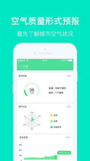 中国环境监测总站空气质量发布软件,用于发布全国338个地级及以上城市实时空气质量状况,及各省(自治区、直辖市)、省会城市、计划单列市环境空气质量预报预警等信息。 【特色功能】 *城市空气质量状况实时发布:随时掌握关注城市的空气质量情况,向公众提供出行及健康指引,数据更新最及时。 *精细化城市预报:及时预报城市空气质量等级,发布未来24、48小时空气质量指数范围及首要污染物,转发当地政府发布的预警信息等。 *全面化空气质量形势预报:支持发布域内各类型污染物变化趋势展示,支持多城市空气质量对比,支持全国、省内各城市空气质量状况展示。 *多单位大数据分析:预报数据来源于各个参与发布的城市、省(自治区…