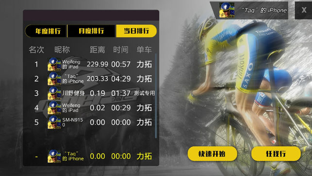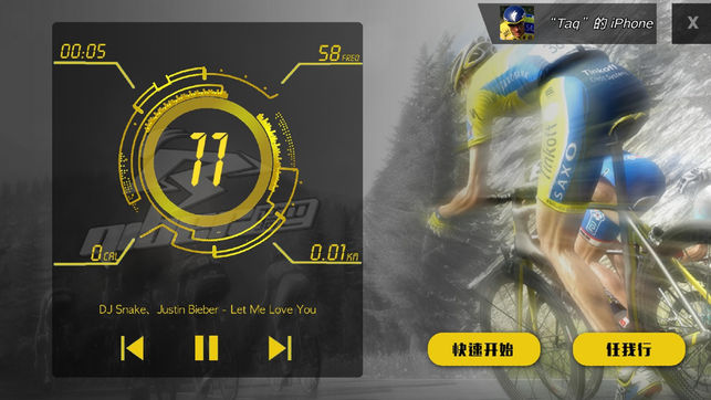 本软件为动感单车配套软件——使用特制的3.5mm耳塞插孔数据线配合动感单车,可使Pad或手机成为智能速码表: (1)显示速度、里程、卡路里、踏频等数据; (2)记录骑行数据,参与排名(当日排行、月度排行、年度排行); (3)参加自行车3D游戏;