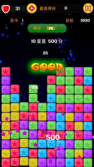 欢乐消星星,全新PopStar,完美支持中文版! 一旦开始,无法停止!-根本停不下来... *免费完整PopStar* *完美中文支持* iPhone上下载最多的消除游戏,全民的最爱!规则非常简单点击两个相同的颜色星星就可以消除。一次消除越多,得分越高! 不断挑战高分记录的同时还能得到生命,更多惊喜得你来发现哦!还可以分享到微博,微信向好友炫耀!也可以在Game Center上和世界玩家一较高下!快来一起玩吧!!! 游戏攻略: *获取红心奖励* 一次消除15~20个星星得到1个红心 一次消除20~25个星星得到2个红心 一次消除25个及以上星星得到3个红心