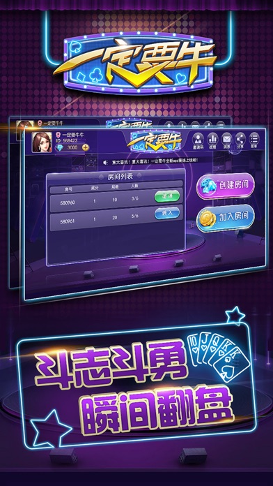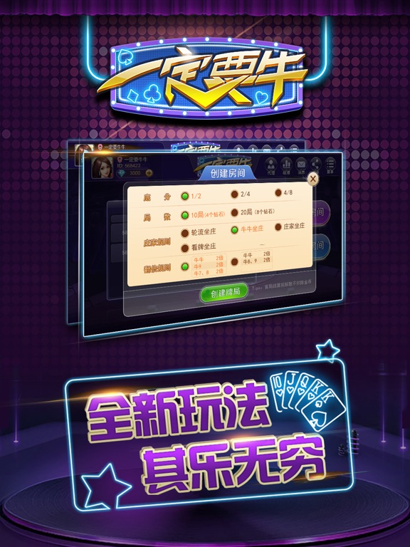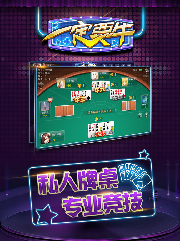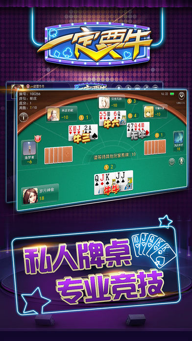 一定要牛,朋友组局,一旦开始,难以放下。其乐无穷,时尚精美画面,真人实战对战。陪您欢乐每一天 【基本玩法】:游戏可以由2人到6人同时进行,总共52张牌(除大小王),在确定庄家后,系统将给予玩家每人5张牌,用户将根据5张牌进行排列组合,并且闲家一一和庄家进行大小比较确定胜负。玩家必须将手中的5张牌分为两组,一组牌数为3张,一组牌数为2张按照牌型大小比较。 【牌型比较】: 玩家把5张牌分为两组后,需要各自和庄家进行大小比较。 第一组3张牌的比较规则:要求玩家必须拿且只拿3张牌组成10、20、30的整数(加法运算)。数字A-10的扑克牌数字代表其大小,JQK统一以10计算。若庄家和闲家有那么三张牌能凑成10或20或30的整数,我们称之为有牛,那么则进行第2组两张牌的大小比较。若庄家或闲家有某人无法使用3张牌凑成10或20或30的整数,我们称之为没牛。 第二组牌的比较则把剩下的两张牌按照加法计算,10的整数倍数最大,1最小,若大于10小于20则取个位数计算。数字越大则牌型越大,数字越小则牌型越小。若第2组牌数字为1我们称之为牛丁,若第2组数字为10或20我们称之为牛牛,其他以牛二、牛三等名称称呼。牌型从小到大排序为:没牛-牛丁-牛二……牛八-牛九-牛牛。 若庄家和闲家都无法使用3张牌凑成10或20或30的整数,即庄闲两家均无牛,则此时进行5张牌中最大一张牌的比较,大小次序为K-Q-J-10-9……A,若最大一张牌也相同则比较余下最大一张,依此类推直到比出大小,若双方牌数相同,纸牌点数一样则根据花色进行比较,大小次序为黑桃、红桃、梅花、方片。 如果您有任何问题,可以联系微信客服和客服QQ群,我们的QQ群也会不定时的开展玩家活动,各种惊喜大奖等你来拿。 官方微信号:ydyn6666 官方QQ号:2466623456 QQ交流群:511231864