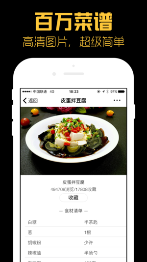 美食菜谱是一个专为美食爱好者,喜欢下厨房的人士设计的一款简单方便使用的菜谱软件。 特色功能有: 1.菜谱超多,超过10万个菜谱随意查看。 2.分类详细,各种详尽分类超细致,更有精致美食每天智能推荐。 3.覆盖各大菜谱,八大菜系,各式甜点,西式美食,法式大餐应有尽有。 4.没有你找不到的食材,只要你想不到的食材。 5.人群分类喜欢各种口味的人群都能在这里找到喜欢的美食菜谱