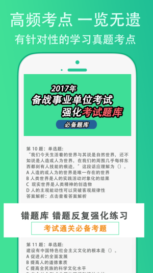 本软件为事业单位考试题库的软件,精心准备了2017年海量试题60000道,适合于2017年(省、市、州、县、乡)事业单位公开招聘工作人员考试,量身为事业单位招聘考试量身打造。 【专项试题内容】 公共基础专项训练包括:时事政治(包括2015年1月~2017年2月及答案含解析)、2017年中央一号文件,2017年中央经济工作会议、2017年中央农村工作会议、供给侧结构性改革、2016年政府工作报告、2016年中央一号文件、十八大专题、十八届五中全会、十八界四中全会、四个全面、马克思主义哲学原理、毛泽东思想概论、邓小平理论和三个代表、“十三五”规划、重要会议以及重要文件,中国特色社会主义、当代中国…