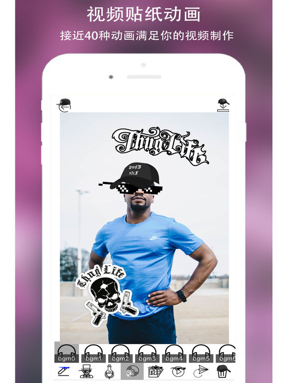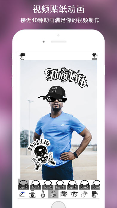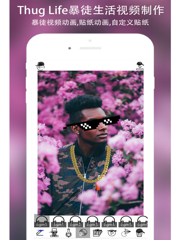 暴徒生活编辑器 视频合成编辑、图片结合版!! 视频功能: 现在开始您可以使用视频合成功能啦!在您喜爱的视频上面添加thug life贴纸,任意位置,制作你自己的暴徒视频! 制作步骤: 1.选择视频 2.选择视频帧 3.在视频帧上添加thug life贴纸,选择喜爱的背景音乐,选择喜爱的滤镜对视频帧处理,更有文字功能,视频动画功能等操作! 4.合成,分享好友,朋友圈 图片功能: 在您的照片添加thug life 流行贴纸吧!您可以扮酷,耍帅,装大款!不同样式的大佬眼镜让您玩转与照片之中! 更多功能尽在新版本哦!一起来玩thug life贴纸吧!开启您的照片暴徒生涯!