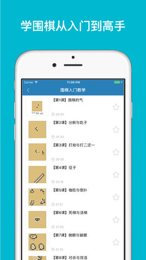 包含大量围棋教学视频!从入门到九段大师!样样齐全! 界面精美!教学讲解通俗易懂! 让你快速开启围棋之路! 解密残局奥秘,围棋练习宝典,少儿学围棋的好帮手,从零开始学围棋,从入门到九段精通全部教程应有尽有,快来开启你的围棋之路吧!轻松入门,忘忧忘愁!