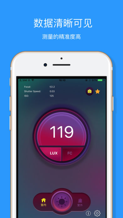 ==最后一天半价!赶快下载吧!== 支持iOS 10! 光照检测器是一款监测记录光照强度的优秀软件。可以用它来检查室内不同时间的光照状况,可以用它调节周围的光线强度,以达到最好的光线环境,可以用它来确定拍照的适当曝光度。这款光照检测器为我们的生活,工作,学习提供全面的光照数值,贴心细致的照顾我们的身心健康,保护我们的眼睛。 特征: — 显示光通量,光照强度,感亮度的数值 — 实时测量,资料精准 — 取适当值,随时查看历史记录值 — 有室内,室外两种模式