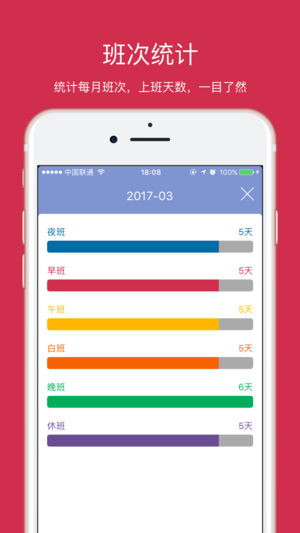 排班 - 上班时间,一目了然。 # 简介 [排班]顾名思义,是一款以日历为基础,记录上班时间的应用。主要针对实行倒班制,上班时间不固定的用户。简单两步设置,便能准确地在日历上排列出上班时间,查看方便,一目了然。不用在台历上拿笔标记,也不用时时去看主管给你的上班安排。让你告别上班时间不确定的痛苦。 # 功能 * 丰富而简洁的日历信息 * Widget 显示,让查看日历和班表更快捷 * 循环排班,一次设置,便能推算出N年班表 * 添加多个班表,自由选择显示,想加多少就加多少 * 自定义待选班次,让排班更自由 * 随意修改已排好的班次,突然的调班也不会错过 * 每月班表统计,本月上了几天班,…