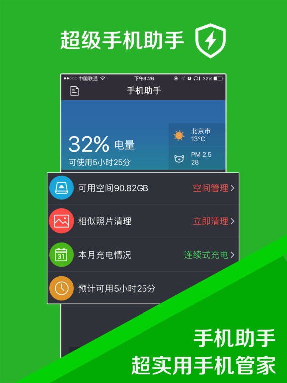 好用的手机助手来了! 杜绝虚假宣传!给你带来最实际的功能! 面向全球发售,简单,易用!功能全面! 准确的信息显示让你轻松管理! 【特色功能】 1.照片清理:一键清除重复照片,给手机更多可用空间。 2.空间管理,轻松管理空间,一键查看视频,音乐,照片,等等其他存储的使用量。 3.充电监控:最易用,最华丽的完全循环充电软件,更重要的是完全免费! 4.电池用量:准确预估电池可用时间 外出不必担心电量不足! 5.系统信息:精准系统信息显示,轻松了解系统运行状况! 6.天气提醒:精准告诉你今日天气状况,雾霾情况!