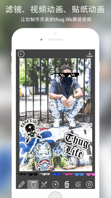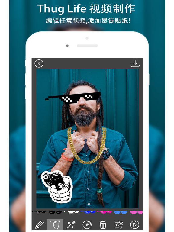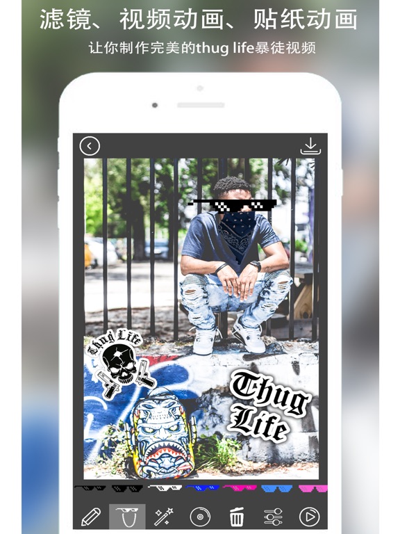 暴徒生活视频制作器! 该app可以完美的制作你想要的thug life 暴徒生活视频! 现在开始您可以制作流行的暴徒视频啦!在您喜爱的视频上面添加暴徒贴纸,翻转,移动,放大都能满足您的需求,开始制作你自己的暴徒视频! 制作步骤: 1.选择视频 2.选择视频帧 3.在视频帧上添加thug life贴纸,选择被音乐,视频动画以及选择贴纸入场动画等操作!完美的创造暴徒视频! 4.合成,分享好友,朋友圈