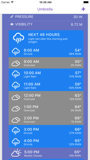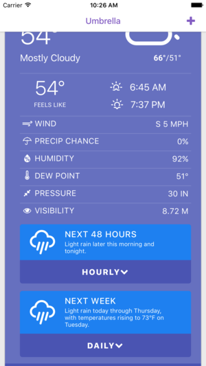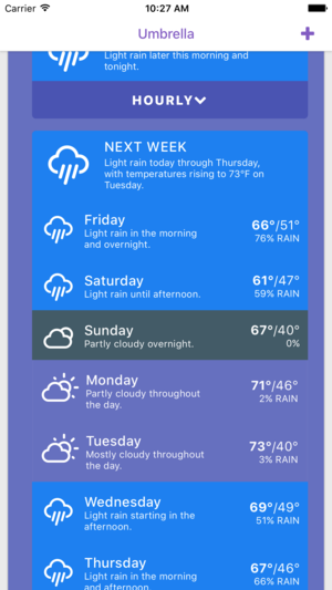 Umbrella is a simple weather app that focuses on the use of color to show the weather now, the next few hours, and the next week in as many locations as you'd like to add. Using bold colors and icons, Umbrella allows you a quick and easy glance at the weather without any distractions. It also includ…