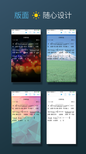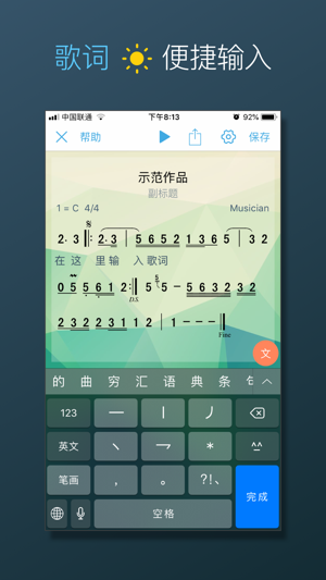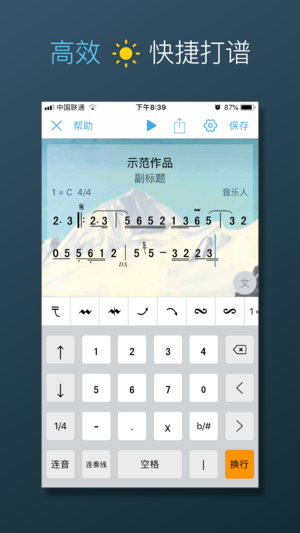 【快捷优雅的简谱作曲工具】 简谱制作、快速记谱、作曲、写歌一应俱全! iPhone & iPad版同步上线! 在写歌方面,简谱比五线谱更高效。 但无奈市场上缺乏好用的简谱打谱软件, 希望我们能帮助大家弥补这个需求。 == 功能特色 == 【快捷简谱打谱】 适合移动设备的人性化打谱设计 - 支持简谱音符输入:多达五个八度音程,从32分音符到全音符 - 支持歌词输入:包括手机上支持的所有语言。 - 支持多种高级符号:包括连音线、小节线、连奏线、倚音、装饰音、反复记号等多种高级符号输入。 - 支持节奏型X的输入 - 支持配置多种乐谱信息:标题、副标题、调式、节拍、作者等 - 手势切换音符音高和节…