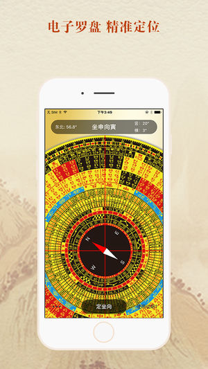 风水罗盘用于立极消砂纳水,它是风水爱好者和专业人士必备的风水工具,此外还为使用者提供专业的罗盘使用说明。 风水罗盘为您提供详尽的专业风水信息,让您在建筑选址、买房、装修时得心应手。 风水罗盘提供以下功能: 1、座向方位和刻度显示; 2、指南针方向定位功能; 3、罗盘可根据您的需要放大与缩小。