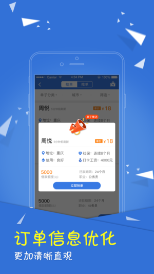 鲢鱼抢单是深圳前海同花顺金融服务有限公司推出的一款服务于贷款人和放贷人的产品。是一个更人性化、贷款服务更精准、贷款方式更便捷、贷款信息更安全的信息共享平台!让贷款人迅速找到更适合自己的贷款产品,放款人迅速找到更优质的用户。 鲢鱼抢单为贷款人和放贷人搭建桥梁。针对贷款人,提供:贷款产品精准匹配、贷款额度自由选择、贷款预约等服务;针对放贷人,提供:贷款人基本信息、优质贷款人筛选等服务。致力于为贷款人提供更人性化的贷款产品,为放款人提供更优质的客户来源。 【产品特色】 1、短时间内更便捷获取精准贷款用户 2、放贷人或放贷机构拥有更多自主选择权 3、随时随地抢单,化被动为主动…