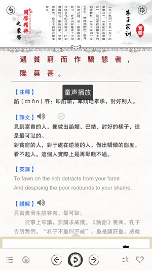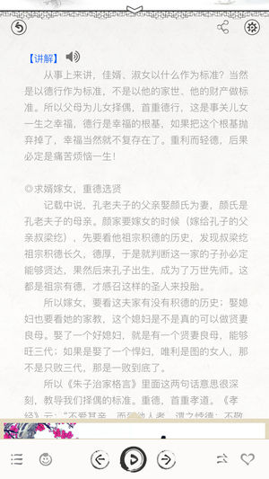 学国学,知礼仪、识大体、长见识、会感恩、懂谦虚、提素质、讲担当! 领略国学魅力,弘扬传统文化。国学的智慧,是中国人生存发展的精神动力和文化源泉。应由更多的家长、老师、学生…共同发扬分享。 《朱子家训》又名《朱子治家格言》、《朱柏庐治家格言》,是以家庭道德为主的启蒙教材。《朱子家训》全文524字,文字通俗易懂,内容简明赅备 ,对仗工整,朗朗上口,问世以来,不胫而走,成为有清一代家喻户晓、脍炙人口的教子治家的经典家训。其中,许多内容继承了中国传统文化的优秀特点,比如尊敬师长,勤俭持家,邻里和睦等,在今天仍然有重大现实意义。 ◎功能特点: 1、精心校对,纯净无广告,支持任何版本的安卓系统和安…