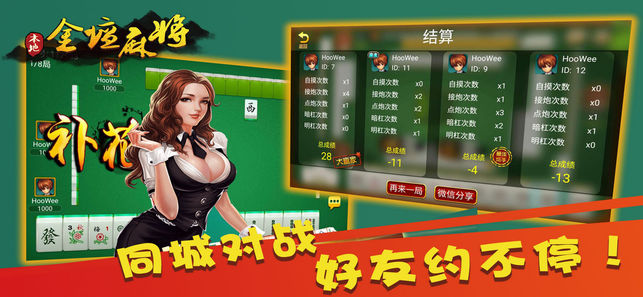 本地金坛麻将,今年最值得期待的休闲类棋牌游戏! 时尚简约的界面,轻松愉快的玩法,陪伴您快乐生活每一天! 最流行的社交游戏平台,真人实时对战玩法,与现实中好友一起组局畅玩金坛麻将!