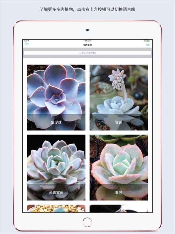 喜欢多肉植物的朋友千万不要错过哦!多肉百科,为多肉爱好者提供最全面的多肉资料库,带你深入地了解多肉植物,走进健康的绿色生活! 特色: * 提供多种多肉植物的介绍和图鉴 * 帮你辨别多肉的品种,从此告别多肉脸盲症 * 多肉植物常见问题解答,为你解决多肉养植的困惑 * 掌握不同多肉种植的养护方法,了解更多的多肉知识 * 分享你喜欢的多肉植物图鉴,让你以肉会友 图文结合的多肉植物基础资料库,帮助多肉新手快速了解各种常见多肉,让多肉爱好者更加热爱多肉!