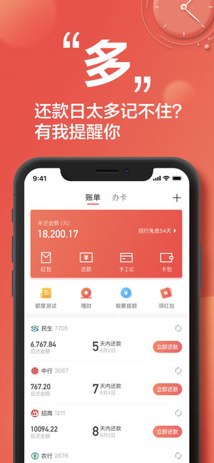 【功能介绍】 账单管理:高效管理所有信用卡,流水账单一目了然。再也不用担心糊涂账和银行吃你逾期的黑心利息。 【获得荣誉】 一寸光阴一寸金,选择挖财更放心;挖财信用卡管家,账单日和还款日智能同步提醒、信用卡一站式管理,让你的信用卡用的更加放心省心。 · 深耕8年,新金融的领头羊,强国富民的践行者; · 专业团队,创新活力十足,服务贴心到位; · 融资几亿美元,深受1亿用户和投资人的喜爱; · 2014年“红鲱鱼”全球百强企业 【联系我们】 怎么样,你心动了是么?是因为妹子我很萌,还是我们产品很赞呢,不重要,重要的是我会好心的给你我们的联系方式的呢。 官方微信:挖财信用卡管家 微信客服:w…