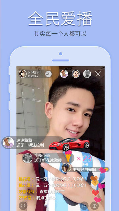 致力于打造最精彩的午夜秀场 我们拒绝平庸,我们喜欢个性,这里有唱歌、跳舞,还有段子、唠嗑、卖萌,你想要的这都有! 万人同时在线视频聊天交友热舞秀场,云集众多俊男靓女为你倾情演绎! 【秒速直播】实时互动、寻求围观。映在每一客,求抱抱、求遇见。 【更新动态】随时随地、想秀就秀。发布照片、拍摄短视频,绝对nice,让你秀的毫无负担,陌生人的微信朋友圈。 【私密聊天】一见钟情不如即可行动。开启直播,让距离近一点,让陌生远一点。