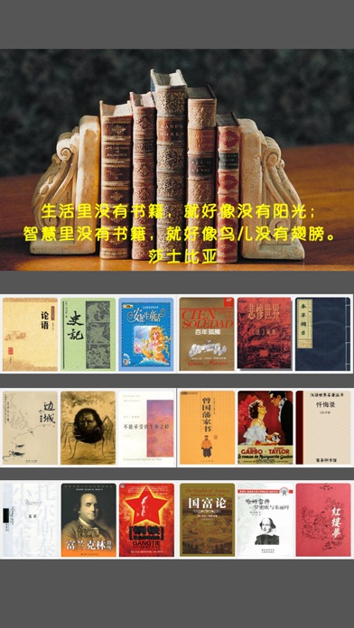 莎士比亚说:“生活里没有书籍,就好像没有阳光;智慧里没有书籍,就好像鸟儿没有翅膀。” 怎样才能不断吸收知识的力量呢?答案就是多读书,读好书,因为“历史使人聪明;诗歌使人机智;数学使人精密;哲理使人深刻;道德使人正经;逻辑与修辞使人能言善辩”。 对于读书的感受,真可谓仁者见仁,智者见智。笔者在此抛砖引玉,希望我们大家都能够多读书,读好书,不断积蓄 “知识的力量”,用知识创造财富,用智慧改变生活! ■■■ 为此我们遴选出60 本传世经典、名家推荐的必读著作: 如有着“两千年中国政治伦理与社会伦理的基石”之称的《论语》; 无愧于“兵家韬略之首,人类智慧之源”的《孙子兵法》; 欧洲长篇小说发展史上具有里程碑意义的《堂吉诃德》; 开辟人类新纪元的《物种起源》; 影响了无数人的中国四大古典名著; 历经半个多世纪而畅销不衰的《飘》; 值得你一生阅读并去体会的《小王子》…… 【特色功能】 - 强大引擎:专业先进且方便清爽的阅读引擎,堪称阅读必备神器。 - 简单易用:对于每一个细节,我们都力求最易用,给您完美的用户体验。 - 智能书签:不需要您人工操作,系统自动记录您的阅读位置。 - 完美体验:精排的文字,多种阅读配色方案,流畅的翻页,系统稳定性能超强。 论语 史记 西游记 三国演义 水浒传 红楼梦 西厢记 孙子兵法 曾国藩家书 本草纲目 边城 雷雨 四世同堂 围城 穆斯林的葬礼 倾城之恋 活着 一千零一夜 伊索寓言 全球通史 变形记 国富论 圣经新译本 堂吉诃德 安徒生童话 吉檀迦利 君王论 呐喊 哈姆雷特 喧哗与骚动 不能承受的生命之轻 复活 飘(乱世佳人) 富兰克林自传 小王子 忏悔录 悲惨世界 情人 战争论 日瓦戈医生 昆虫记 梦的解析 汤姆叔叔的小屋 物种起源 瓦尔登湖 百年孤独 神曲 简·爱 红与黑(闻家驷译本) 约翰·克利斯朵夫 罪与罚 美的历程 老人与海 苏菲的世界 茶花女 钢铁是怎样炼成的 雪国 麦田里的守望者
