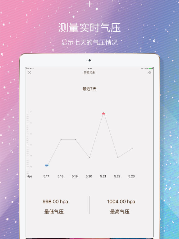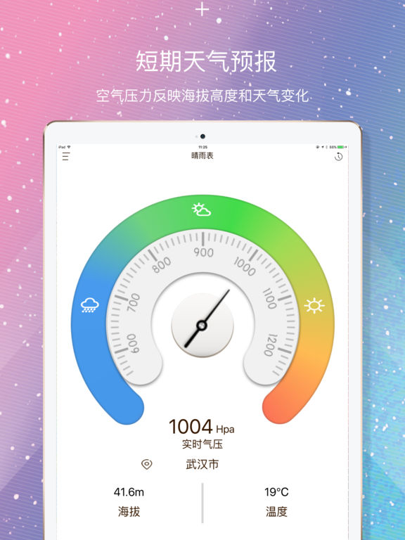 这是一款外出旅游、户外达人的必备软件,让你以最快的速度获取到所在地的海拔、位置、气压等信息。 **可用于几乎所有的户外和室内活动,如登山,徒步郊游,旅行,甚至爬楼梯。 ** 因为空气压力变化可表明天气变化,所以你可以用这个程序来监测和预测短期的天气。 **实时精准显示所处位置的海拔高度。 **支持气压测量海拔高度。 快来下载吧,更多功能与更新敬请期待!