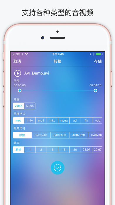 ==最后一天半价!快来下载吧!!== 音视频转换器 - 可以让您轻松转换各种音视频格式,还可以把视频中的音频提取出来保存为你想要的格式,同时还是一款简单易上手的音视频裁剪器,更是一款视频格式转换器/音频格式转换器。 要什么格式的音频、视频,你说了算! 特色功能: 1. 支持从本地相册、iTunes、WiFi导入音频、视频 2. 转换多种格式音频、视频 3. 截取一段喜欢的视频或音频 4. 提取并保存为多种格式的音频文件,如mp3,wma,m4a... 快来下载吧!!