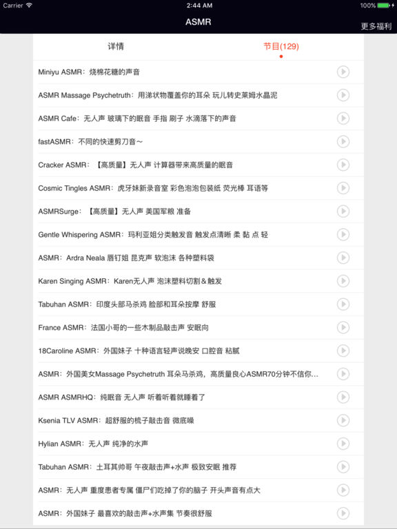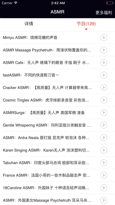 ASMR也被称为颅内高潮,ASMR相关的音效会让听者产生背部点刺、头皮发麻、颅内发麻等感受,会让人感觉到舒服,放松和愉悦。 ASMR是很多人的睡前伴侣。 这款软件搜集了大量的ASMR录音,包括国内外的各种ASMR女主播,戴上耳机,这些ASMR录音会让人放松,仿佛身处自然环境中,不知不觉中进入睡眠。 很多睡眠困难的朋友,或者睡眠环境不好,噪声较多的朋友,例如大学寝室,戴上耳机,听着这些ASMR音效,就能轻松入眠,极大的改善了睡眠质量,第二天的工作精力充沛。 ASMR,每天都更新