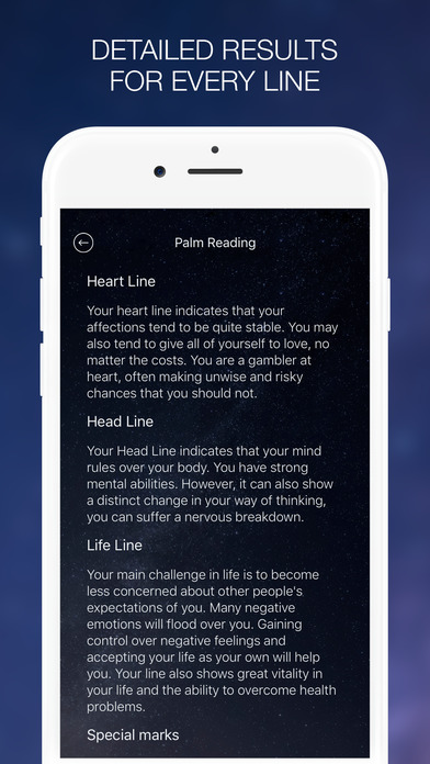 Palmistry is an ultimate fortune-telling app that helps you find out more about your future. You will get detailed personal results about your health, life, heart lines and special marks. All you need is to scan both left and right palms. Be confident and ready to face the future! Along with palm readings, the app provides daily horoscope forecasts and compatibility tests that fit every taste. See what your sun sign has to tell you. Discover your mutual compatibility for love, success, parentship and much more! Know every aspect of your future today! FEATURES: - Accurate and instant palm reading - Daily horoscope forecasts - Multiple compatibility tests The app contains the following subscription options: - Monthly ($4.99) with a 7-day free trial period - Free trial subscription is automatically renewed unless cancelled 24 hours before the renewal - Any unused portion of a free trial period, if offered, will be forfeited when the user purchases a subscription to that publication - Subscriptions may be managed by the user and auto-renewal may be turned off by going to the user's Account Settings after purchase Privacy Policy: http://www.devroqapps.com/privacy.html Terms of Service: http://www.devroqapps.com/terms.html * The app cannot guarantee 100% accurate data, consider using it for entertainment purposes.