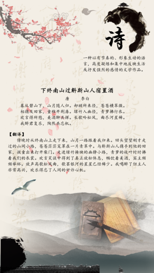 诗者,感其况而述其心,发乎情而施乎艺也。" (诗友交流群:304434331) 有大江东去的豪放明快,有低头弄梅的婉媚曲折,也有西窗剪烛的情深意重。诗词之美,时光洗练。好的诗词,每个字、每一句,都能叩开人的心房,触发无限的遐想! 「诗词专业版」精选中国唐诗、宋词、古文,共计五千余首古诗词。此外一大波古诗词正在赶来的路上(陆续更新7万首诗词,敬请期待)。 为你提供一个干净清新的欣赏空间。 「诗词专业版」是按照不同主题分类的形式展现古诗词。目前包含:春节、元宵、清明节、寒食节、春、夏、秋、冬、诗经、七夕、写雪、山水和田园主题... 功能介绍: 1.-儒雅大气的中国风设计: 诗词的设计是对中华…