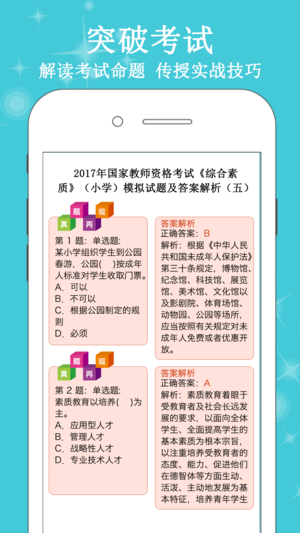 本软件为教师招聘考试题库的软件,适合于2017公开招聘招聘考试,精选试题含试题解析,量身打造。 1、教育综合基础知识(中小学通用):教育综合基础知识习题强化练习,可选择不同题型,并可手动将易错或未牢固掌握的题加入复习库和错题库,以便反复练习,还包括模拟试题十五套。 2、幼儿园招聘试题:包括幼儿园教育理论专项练习和幼儿园学前教育专项练习,可选择不同题型,并可手动将易错或未牢固掌握的题加入复习库和错题库,以便反复练习,还包括模拟试题二十二套。 3、学科专业模拟试题:精选各个学科专业最新模拟押题,共199套,含解析,可自动将错题加入到错题库。 4、特岗教师招聘试题:精选特岗教师招聘试题,含解析,可…