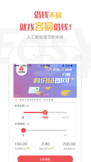 容易借钱是一款走心的借款神器,致力于为短期内急需现金的用户提供无抵押、无担保、审核快!准!稳!且放款极速的短期小额现金贷服务,门槛非常低,身份证即可急速申请救急钱,通过率高,让你随心随易,想贷就贷!让借钱变得非常容易! 联系客服: 请关注微信公众号“惠民速达”,或拨打021-61107424咨询客服