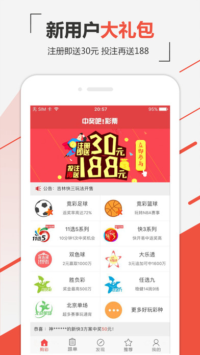 中奖吧!彩票注册送大礼包,福彩体彩彩种齐全,带你中不停!公司通过大数据分析历史中奖号码,及其各种参数走势图分析彩票历史数据。提高你的中奖率,让你离大奖越来越近。是一款集合分析、数据参考的专业彩票软件! 具体提供实时福彩开奖、走势图、体彩开奖、竞彩足球比分直播,对阵数据参考。让你玩赚体彩福彩,大奖中不停! 本软件功能齐全、安全方便、操作简单,各类彩种玩法介绍详细明了。 中奖吧!彩票为回馈新老客户不定期推出各类优惠活动。欢迎你的加入! 下载使用过程中有任何疑问,在线客服24小时为您服务,解答您的疑惑! 客服热线:4000696159 中奖吧!彩票祝您好运连连!