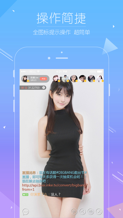 嗑瓜群众都喜欢的直播软件,让你high到不能停的直播平台! 汇集千万观众,直播主题由你定! 【一键开播】告别繁琐,随时随地直播就是这么So easy! 【秘密私聊】创造私密互动空间,零距离接触你的男神/女神。 【极致美颜】智能美颜,感觉自己美美哒。 【缤纷礼物】心动主播,礼物传情尽情相送。 【游戏互联】亲密游戏互动,斗智斗勇。 好玩还有趣,叫上朋友一起播,直播间内等你嗨~