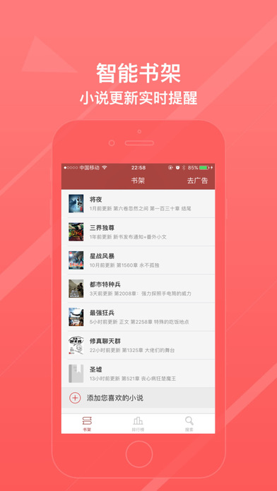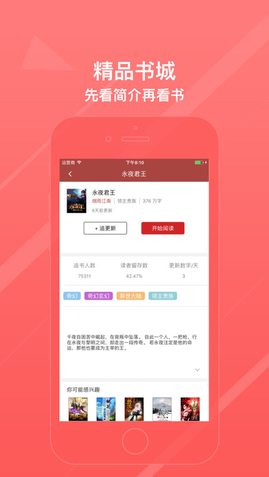 最丰富的小说资源,最优质的小说内容,最全面的小说类型,最舒适的阅读体验,只为成为你身边最亲密的阅读小伙伴儿。 【特色功能】 完全免费!郑重承诺永久无积分,永久无内购,真正免费; 最新的电视剧热播小说:《鬼吹灯》,《人民的名义》,《三生三世十里桃花》,《我的前半生》,《如懿传》,《醉玲珑》,《楚乔传》等等 海量资源:来自互联网海量小说搜索资源,即搜即得; 优质内容:大量完结、连载、出版小说,同时提供高品质听书资源,品质最优; 全面的小说类型:玄幻、都市、言情、武侠、科幻、军事、职场励志,应有尽有; 舒适的阅读体验:多种阅读主题、夜间模式、翻页效果,随意切换阅读页横竖屏; 实时的小说更新:连载小说,更新提醒,第一时间获取最新章节,随心阅读; 我们还提供完善的在线免费书城,可以看的更多。