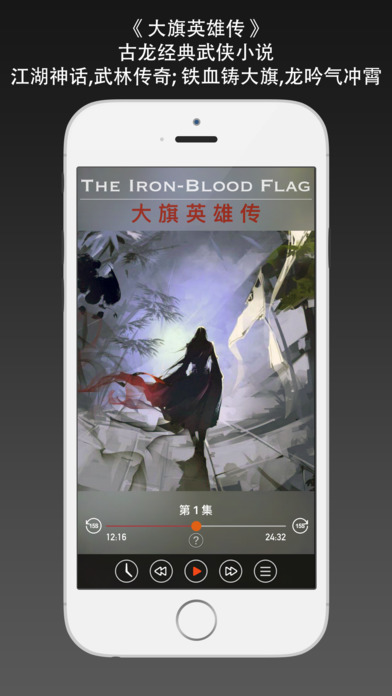 《大旗英雄传(铁血大旗)》,古龙武侠小说有声典藏版,刘杰演播。 一部扣人心弦的经典武侠传奇,一部荡气回肠的爱情史歌,一幅如诗如画的美丽画卷,一曲沁人心脾的美妙乐章。 无广告,无内购,不联网。 《大旗英雄传》又名《铁血大旗》,是古龙一部跨时代的作品,也是古龙特别珍爱的一部作品,是古龙唯一一部后期重新予以修订的作品。本书气势宏伟,情节绚丽璀璨,是古龙自成风格、走向成熟的不可多得的一部成名武侠巨著。 《大旗英雄传》写于1965年,与《武林外史》、《绝代双骄》、《浣花洗剑录》堪称古龙中期“四大名著”,这四部名著不仅在古龙小说系列,在整个武侠文学中,都是重量级的作品。古龙创作《大旗英雄传》时当盛年,满腔热血,数十万字的文稿,洋洋洒洒,气贯长虹,令人拍案叫绝。作为古龙一部跨时代巨作,标志着古龙作品开始迈向成熟,成为进入第二阶段作品的标志和分水岭。 一个机智坚韧铁血热心的精神领袖,一个激情飞扬单纯质朴的铁血男儿,一个清丽脱俗不染凡尘的空谷幽兰,一个柔情似水妩媚动人的风尘美女,相逢在古龙的武侠世界,演绎出阴谋与爱情、仇恨与亲情、忠诚与背叛、寻宝与复仇的江湖传奇故事…… 昔年,中原武林“大旗门”遭遇灭顶之灾,侥幸逃脱的大旗门少年弟子铁中棠、云铮等在掌门人云翼的带领下远遁荒漠卧薪尝胆,伺机复仇…… 十多年后,云翼认为时机成熟,便率领大旗门人,重返中原武林。不料,云翼长子云铿与大旗门死敌寒枫堡主冷一枫的长女冷青霜坠入情网,险些使大旗门再遭灭门之灾。云翼愤怒之余命掌刑人铁中棠将云铿五马分尸…… 云铿弟云铮私下寻仇,陷入重围暴露大旗行踪。云翼震怒之下,将铁中棠、云铮赶出大旗门…… 铁中棠设下疑兵之计,牵制五福联盟,云铮现身拼命,身受重伤。铁中棠冒死救出云铮,却被云铮误会投靠“五福联盟”而坠入断肠谷…… 铁中棠死里逃生,遇一生至爱水灵儿,得“大旗门”掌门令旗。重入江湖,为破夜帝之子朱藻的“七仙阵”,以七日时间苦研武功,功力大进;“五福连盟”盟主司徒笑,联合“毒神”冷一枫,派出“风、雨、雷、电”四大高手劫杀铁中棠。铁中棠身负重伤,朱藻之母以“嫁衣神功”为其治伤,苦练了十几年的内力,却悉数冲入了铁中棠的体内,反使他成为一名内力浑雄的顶尖高手…… 江湖圣地“长春宫”血洗江湖,铁中棠不敌“长春宫”门主日后被打入万蛇洞内。因缘际巧合得夜帝传授毕身武学,参悟大旗绝学“四季剑”,终成天下第一高手…… 长春岛上正邪对决,母子相认兄弟同心,“大旗门”、“五福联盟”、“长春宫”三代恩怨热血男儿以血还血……