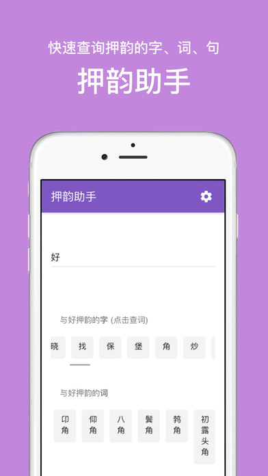 输入你想押韵的字后,会列出所有押韵的字——几乎涵盖了所有的常用字和冷僻字。 还会列出提供大量押韵的词汇和短句,启发你的灵感。 将来还会列出押韵的经典诗词、名著句子、网络流行语等。 这款APP可以提高你文案创作、诗词写作、金句创作的效率。
