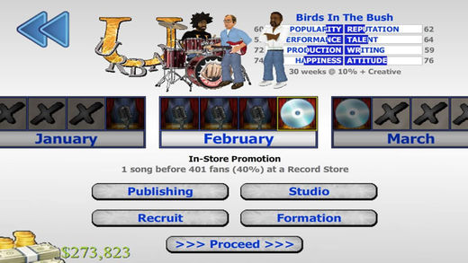 This special VIP edition of the music industry sim allows you to enjoy it at its best with no interruptions - plus a Backstage Pass that invites you behind the scenes to save your changes to all 150 characters! Bring your music collection to life with animated performances as you embark on a career in the industry. Form your own band by recruiting talent from over 100 artists across 6 unique labels. Then record hits that will top the charts and take them on the road to over 20 different venues - complete with real reviews that scrutinize your strengths and weaknesses. With an endless schedule of possibilities before you, and an ever-evolving industry to immerse yourself in, Popscene captures the highs and lows of music in the palm of your hand! * Please note that this game's use of MP3s may not be compatible with some devices. If this affects you, consider turning off MP3 music in the options. PLAYING GUIDE: Popscene divides the music making process into entertainment (represented by stars) and artistry (represented by hearts). As in real life, popular music is more likely to shoot up the charts and draw fans - but without substance, the success may be short-lived. Each of the game's many artists has the following attributes that influence this process: - POPULARITY is the artist's ability to draw fans to entertaining content. - REPUTATION is their ability to draw fans to artistic content. - PERFORMANCE is their ability to perform entertaining songs live. - TALENT is their ability to perform artistic songs live. - PRODUCTION is their ability to compose entertaining music. - WRITING is their ability to compose artistic music. - HAPPINESS is the pleasure they currently get from their work. - ATTITUDE indicates how likely they are to either contribute or cause trouble. Each week, depending on the size of your team and their collective attitude, new songs may be recorded. Each member of the team contributes their score to a new song, and whoever scores the highest will be credited with making it. Members who are dedicated backstage staff will contribute twice instead of once - increasing the chances of a good song being written. Once songs exist, it is the on-stage performers who must bring it to life. As with writing, each band member on stage contributes their score and the highest determines how well the song was received in each category. This time, it is the frontman who gets to contribute twice instead of once - so consider who is at the forefront. The overall rating for a show is the average of all the songs performed - albeit slightly more generous so that perfection is not required. This is also true of album reviews. A 5-star performance may consist of consistent 4-star contributions. Reviews are where your performances feed back into the stats that produced them, because each attribute will rise or fall to reflect what just happened. When booking venues, you must consider how much it will cost versus how much you are likely to recoup. Tickets are sold at $5 per song so it depends how long your set is. You will receive a percentage of this revenue, and must then use that to pay your employees and any other expenses. Singles are sold at $1 each whereas albums are sold at $1 per song for a maximum of $10. If you have a week of inactivity, you may find that you make a loss because of the expenses of your lifestyle (which reflects your wealth). I regret there is more to this game than I could ever explain here, so enjoy figuring some things out for yourself!
